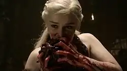 ![]() Daenerys comendo um coração de cavalo em ritual dothraki. | |||