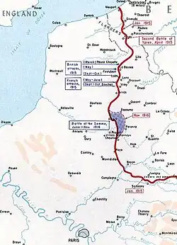 Tolkien foi designado para os Fusileiros de Lancashire [en] que lutaram na Batalha do Somme a partir de setembro de 1916. O batalhão de Tolkien permaneceu na reserva durante a primeira semana. Ele entrou em ação em Ovillers [en], com a companhia de Tolkien novamente na reserva para transportar suprimentos. Tolkien tornou-se oficial de sinais do batalhão e frequentemente trabalhava próximo à linha de frente. O batalhão ajudou a vencer a Batalha da Cordilheira de Thiepval no final de setembro e participou da captura da Trincheira Regina no final de outubro. Em 25 de outubro, ele contraiu febre das trincheiras e foi enviado de volta para casa duas semanas depois.[4][5][6][7]