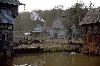 O moinho de vento era uma perspectiva forçada de 60 metros de altura exterior (visível a estrada de viajantes a quilômetros de distância), um conjunto de base e no piso superior e uma miniatura trimestre em escala. O interior da fábrica, que foi de cerca de 30 metros de altura e 25 metros de largura, destaque engrenagens de madeira, equipados com mecanismos de moagem de farinha. Uma visão mais ampla do moinho de vento foi rendido em um estúdio Leavesden definido com um moinho de vento trimestre em escala completa, com pás rotativas, pintado com um céu no cenário e efeitos especiais de fogo. "Foi assustador para os atores que estavam tendo a lenha explodir neles", relatou Heinrichs. "Havia controles no lugar e as pessoas que estão perto com mangueiras, é claro, mas há sempre a chance de algo dar errado".[32] Para o tiro final da fábrica em chamas explodindo, o moinho de vento em escala trimestre e cenário pintado foram erguidas contra a parede exterior do "galpão de voo", um hangar espaçoso no lado mais distante da Leavesden Studios. Paredes interiores do hangar foram derrubadas para criar uma corrida de 450 metros, com uma largura de 40 pés ainda permitindo treinador e câmeras. Heinrichs adaptou os conjuntos para então o cinegrafista Emmanuel Lubezki poderia gravar de cima sem ver o final da etapa.[32]