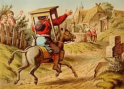 | O irmão mais novo volta para casa com a mesa, o asno e o cacete. Ilustração de um livro de contos de fadas do final do século XIX. | |