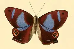 Ilustração de A. echerius, em vista superior, uma espécie pouco vistosa do gênero Abisara,[5] bem distribuída na região indo-malaia.[1]
