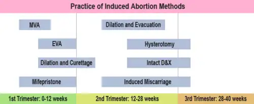 Quando o feto está com idade gestacional avançada, de seis a nove meses, alguns países aplicam o método de "partial birth abortion" (aborto por nascimento parcial), motivo de sérias controvérsias legais.[6]
