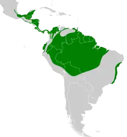 Presente em toda a Amazônia brasileira e na faixa costeira, de Alagoas ao Rio de Janeiro. Encontrado também do México ao Panamá e em todos os demais países amazônicos - Guianas, Venezuela, Colômbia, Equador, Peru e Bolívia.[4]