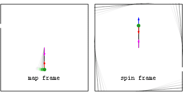 Da mesma forma, estando em um planeta não giratório (e na Terra para fins práticos), os observadores experimentam uma aceleração adequada para cima devido à força normal exercida pela Terra na sola de seus sapatos. Isto cancela a aceleração geométrica descendente devido à escolha do sistema de coordenadas (uma chamada “moldura de concha”[4]). Essa aceleração descendente torna-se coordenada se eles inadvertidamente saltarem de um penhasco para uma trajetória de aceleração adequada zero (geodésica ou de chuva).