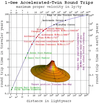 Este gráfico mostra como uma nave espacial capaz de aceleração de 1-g (10 m/s2 ou aproximadamente 1,0 ano-luz por ano ao quadrado) por 100 anos pode impulsionar uma viagem para quase qualquer lugar do universo visível e voltar durante um tempo de vida.