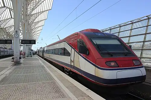 ![]() Automotora Alfa Pendular 4005, a mesma envolvida no acidente, na Gare do Oriente em 2015, ainda com o esquema de cores azul, branco e vermelho. | |