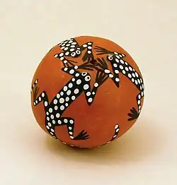 Acoma cerâmica remonta há mais de 1000 anos. Argila local densa, desenterrada em um local próximo, é essencial para a cerâmica Acoma. A argila é seca e fortalecida pela adição de cacos de cerâmica pulverizada. As peças então são moldadas, pintadas e queimadas. Padrões geométricos, thunderbirds e arco-íris são desenhos tradicionais, que são aplicados com o pico de uma mandioca. Após a conclusão, um oleiro golpeava levemente a lateral da panela e a segurava no ouvido. Se o pote não tocar, o pote irá rachar durante o disparo. Se isto fosse encontrado, a peça seria destruída e triturada em cacos para uso futuro.[9]