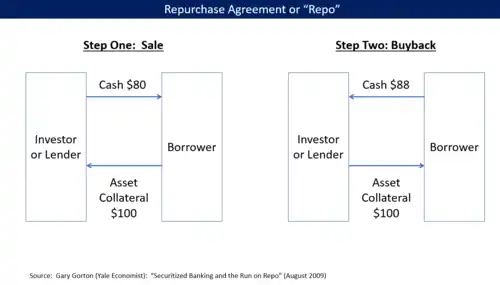 O mercado de operações compromissadas (repo market) é uma importante fonte de recursos para grandes instituições financeiras no setor de bancos não depositários, que cresceu para rivalizar com o setor de bancos depositários tradicional. Grandes investidores institucionais, como fundos mútuos do mercado monetário, emprestam dinheiro a instituições financeiras, como bancos de investimento, em troca de (ou garantidos por) garantias, como títulos do Tesouro e títulos lastreados em hipotecas detidos pelas instituições financeiras mutuárias. Estima-se que um trilhão de dólares por dia em valor colateral é negociado nos mercados de repo.[1][2]