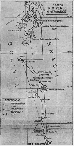Conforme Gondin da Fonseca, apenas no setor do Rio Verde, o Brasil perdeu uma área maior que a do finado Estado da Guanabara.[9] Em 1908, o Coronel Fawcett (P. W. Fawcett) chefiava na Bolívia uma expedição em cata da nascente do Rio Verde, e em 1909, informou tê-la encontrado. Todavia, o Brasil nunca a reconheceu como tal. Por não a termos reconhecido é que se formou em 1944 uma Comissão Mista Brasileiro-Boliviana a fim de a descobrir. Chefiava a expedição brasileira o então Coronel Sebastião Claudino de Oliveira e Cruz. Depois de meses de trabalho no campo, essa Comissão Brasileiro-Boliviana descobriu, em 1945, a verdadeira nascente do Rio Verde. Uma ata foi lavrada e um mapa assinado por brasileiros e bolivianos. A nascente real do Rio Verde, — asseverou em 1945 a Comissão Mista Brasileiro-Boliviana, — assinala-se a 14 graus, 49 minutos, 6 segundos e 15 centésimos de latitude sul e 60 graus, 26 minutos, 9 segundos e 76 centésimos de longitude oeste. Contudo, Juscelino Kubitschek ignorou os estudos da comissão e cedeu aos desejos bolivianos.[9]