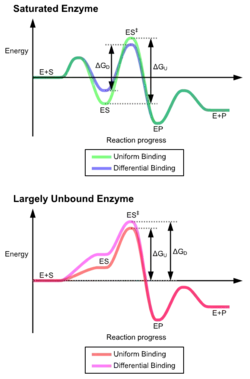 Estes efeitos levaram a maioria das proteínas a utilizar o mecanismo de ligação diferencial para reduzir a energia de ativação, pelo que a maioria dos substratos apresenta uma elevada afinidade pela enzima enquanto se encontram no estado de transição. A ligação diferencial é realizada pelo mecanismo de ajuste induzido: o substrato liga-se primeiro fracamente, depois a enzima muda de conformação, aumentando a afinidade do estado de transição e estabilizando-o, reduzindo assim a energia de ativação necessária para o atingir.