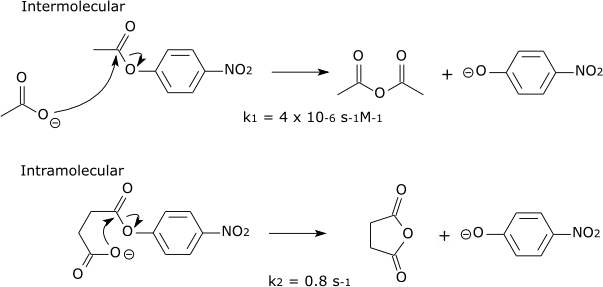 | A concentração efectiva de acetato na reacção intramolecular pode ser estimada como k2/k1 = 2 x 105 Molar. |