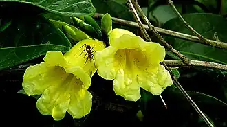 As flores agrupam-se em inflorescências axilares do tipo racemo, com brácteas decíduas envolvendo cada broto. As flores são amarelas, com cálice em forma de taça, 5–8 mm de comprimento, com bordos por vezes 5-dentados, mas em geral bilabiado, com 1–2 mm de comprimento. A corola é infundibuliforme-campanulada, com 2,5-6,9 cm de comprimento e 0,9-1,9 cm de largura na boca, puberulenta exteriormente. Estames com tecas ligeiramente divergentes; ovário cilíndrico, com 3-3,5 mm de comprimento e 1,5–2 mm de largura, lepidoto; disco pulviniforme, com 2 mm de comprimento e 3 mm de largura.[4]