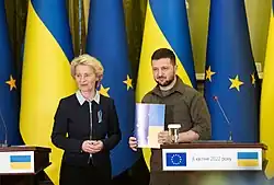 - ↑ «Obtaining Ukraine's EU membership candidate status is of great importance for the Ukrainian people - President during a conversation with Ursula von der Leyen». 9 de maio de 2022. Consultado em 10 de maio de 2022
