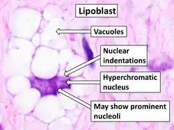 A adipogênese é a formação de adipócitos (células de gordura) a partir de células-tronco.[1] Envolve duas fases: determinação e diferenciação terminal. A determinação é que as células-tronco mesenquimais se comprometem com as células precursoras dos adipócitos, também conhecidas como lipoblastos ou pré-adipócitos, que perdem o potencial de se diferenciar em outros tipos de células, como condrócitos, miócitos e osteoblastos.[2] A diferenciação terminal ocorre quando os pré-adipócitos se diferenciam em adipócitos maduros. Os adipócitos podem surgir de pré-adipócitos residentes no tecido adiposo ou de células progenitoras derivadas da medula óssea que migram para o tecido adiposo.[3]