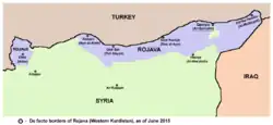 ![]() Território de facto reclamado pelo Rojava e controlado pelas Unidades de Proteção Popular Território reivindicado pelo Rojava sob controle parcial das Unidades de Proteção Popular | |