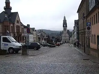 O Johanniskirche foi construído em 1498. A vila foi destruída por um incêndio em 1768. O Freiberger Tor, o último portão restante de toda Vogtlandkreis, foi reconstruído entre 1768 e 1773 com um andar superior de madeira. A atual prefeitura foi construída em 1896 - um período em que várias casas foram construídas ao redor do mercado.