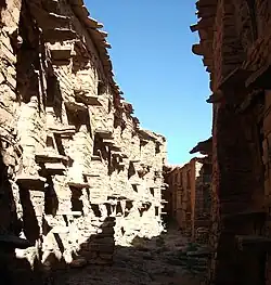 As portas são feitas em madeira e decoradas com motivos que denunciam fortes influências amazigues e subsarianas. As escadas são construídas com lajes de calcário com uma metade encastrada nas paredes. Noutros casos, são usados como escadas troncos de palmeira com entalhes.