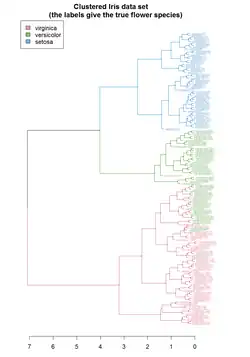 - R possui funções internas[22] e pacotes que fornecem funções para agrupamento hierárquico.[23][24][25]