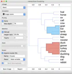 - Orange, uma suíte de software de mineração de dados, inclui agrupamento hierárquico com visualização interativa de dendrograma.