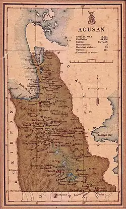 Em 31 de dezembro de 1916, durante a ocupação estadounidense de Filipinas, o archipiélago se reorganizou territorialmente sobre a base de 36 províncias ordinárias, as 7 províncias do Departamento de Mindanao e Joló, uma das quais era Agusán, e o território da cidade de Manila.[4] A capital provincial era Butuán e formavam-na estes três municípios: