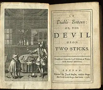 Frontispício e página de título de uma edição em inglês de 1708 de The Devil upon Two Sticks, também conhecido como Le Diable boiteux.