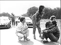 ![]() Alberto (agachado, de branco) olhando Moria Casán em uma cena, 1986.