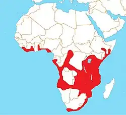 Esta espécie tem uma distribuição alargada na África subsariana, ocorrendo em África do Sul, Angola, Botswana, Burkina Faso, Burundi, Camarões, Costa do Marfim, Eswatini, Etiópia, Gabão, Gana, Libéria, Malawi, Moçambique, Namíbia, Níger, Nigéria, Quénia, República Centro-Africana, República do Congo, República Democrática do Congo, Ruanda, Senegal, Somália, Tanzânia, Uganda, Zâmbia e Zimbabué.