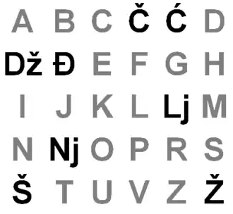 | A | B | C | Č | Ć | D | Dž | Đ | E | F | G | H | I | J | K | L | Lj | M | N | Nj | O | P | R | S | Š | T | U | V | Z | Ž |