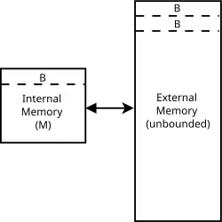 O modelo consiste em um processador com cache ou memória interna de tamanho M, conectado a uma memória externa ilimitada. Tanto a memória interna quanto a externa são divididas em blocos de tamanho B. Uma operação de entrada/saída ou transferência de memória consiste em mover um bloco de B elementos contíguos da memória externa para a interna, e o que determina o tempo de execução de um algoritmo é o número dessas operações de entrada/saída.[4]
