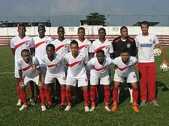 Seu uniforme é composto de camisa vermelha com gola branca, calção branco e meias brancas.