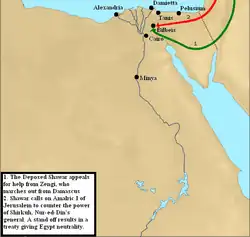 Recentemente o vizir Xauar do Egito tinha sido deposto e substituído por um novo vizir, chamado Dirgham. No início da invasão, os cruzados derrotaram o exército de Dirgham em Pelúsio, forçando-o a retirar para Bilbeis. Então os egípcios abriram as barragens do rio Nilo, travando os invasores com a inundação.