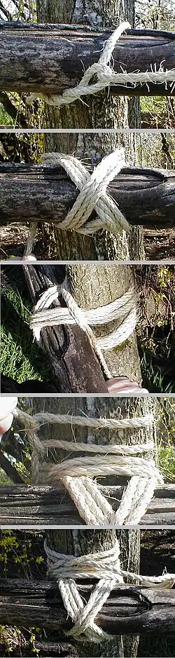 Este nó é ideal para utilização em abrigos feitos com paus roliços como tronco de árvores, cobertos normalmente com folhas no meio das florestas.