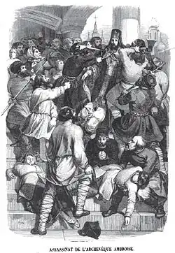 Em 15 de setembro de 1771, após o toque do alarme dos sinos, vários milhares de pessoas, armadas com porretes, machados, pedras e estacas, reuniram-se nos portões de Varvara e Ilyinsky gritando: “Estão roubando a Virgem Maria!” Nesse dia, a multidão invadiu o mosteiro de Chudov, no Kremlin, e o saqueou. No dia seguinte, a multidão dirigiu-se ao mosteiro Donskoy, onde o arcebispo se escondia. O clérigo foi encontrado no coro da igreja do mosteiro, arrastado para fora das paredes e submetido a um interrogatório público. Um dos rebeldes, o servo Vasily Andreev, golpeou Ambrósio com uma estaca, após o que o arcebispo foi espancado e torturado por um longo tempo.[2] O corpo do assassinado foi levado para a Catedral Pequena, onde permaneceu até a chegada do conde Gregório Orlov.