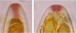 Reação de iodo de anéis apicais de ascos hemi-amiloides de Hysteropezizella (Helotiales) em função do reagente de iodo (IKI, MLZ) e pré-tratamento com KOH.[8]
