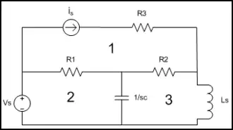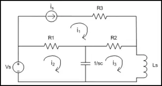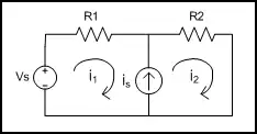 Se há uma fonte de tensão na corrente de malha, a tensão na fonte é somada ou subtraída dependendo se é uma queda ou subida de tensão na direcção da corrente de malha. Para uma fonte de corrente que não esteja contida em duas malhas, a corrente de malha tomará o valor positivo ou negativo da fonte de corrente dependendo se a corrente de malha está na mesma direcção ou em direcção oposta à fonte de corrente.[2] A seguir propõem-se as equações do circuito da figura 3, assim: