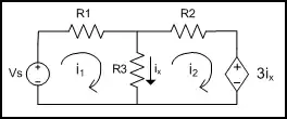 Quando uma fonte dependente está numa malha essencial, a fonte dependente deveria ser tratada como uma fonte normal. Após que se tenha proposto a equação de malha, se precisa uma equação para a fonte dependente. Esta é uma equação que relaciona a variável da fonte dependente com a corrente ou tensão da fonte da que depende do circuito. A seguir há um exemplo simples de uma fonte dependente.[1]