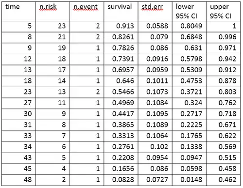 - "std.err" é o erro padrão da "survival" estimada. O erro padrão da estimativa do limite de produto-limite KM é calculado usando a fórmula de Greenwood, e depende do "n.risk", do "n.event" e da "survive".
