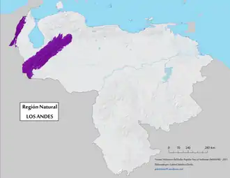 O sistema andino venezuelano representa a bifurcação terminal da Cordilheira Oriental da Colômbia, que em território venezuelano consiste em dois ramos montanhosos: a Serra de Perijá, menor, ligeiramente deslocada de sudoeste a nordeste com 7.500 km 2 na Venezuela; e um sudoeste maior e francamente orientado para o nordeste com cerca de 40.000 km 2, a Cordilheira de Mérida, comumente conhecida como os próprios Andes venezuelanos.[1] O ponto mais alto da Venezuela está localizado nesta região natural.[2] Cobre cerca de 5,2% do território nacional, sendo a 4ª maior região natural da Venezuela.