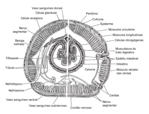 De maneira geral, na periferia da região interna dos anelídeos, há um tecido conjuntivo entre a epiderme e a camada de músculos circulares compostos por diversos feixes conectados que contornam o perímetro da parede corporal, mas não por todo seu comprimento, em "Polychaeta" são interrompidos na região dos parapódios. Seguido por uma camada evidente de músculos longitudinais, que percorrem todo o corpo do animal, o peritônio e, por fim, a cavidade celômica. O celoma normalmente é dividido em dois lados por um mesentério situado na metade, neste, fica algumas das estruturas que passam ao longo de todos os segmentos, como o tubo digestivo, os vasos sanguíneos longitudinais e, em alguns casos, os cordões nervosos.[5] O peritônio, um tecido que circunda todo o perímetro de ambas as cavidades, pode ser dividido em duas partes: o parietal e o visceral. O primeiro contorna a parede do corpo e é de espessura diminuta. O segundo passa pelo mesentério, é mais grosso e apresenta algumas especificidades, como, na região do tubo digestivo, suas células são modificadas. Este apresenta uma função análoga ao fígado, de sintetizar e armazenar carboidratos e lipídios.[3]