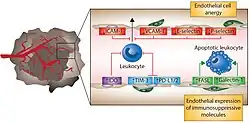 A anergia das células endoteliais foi descrita pela primeira vez em 1996, quando foi demonstrado que as células endoteliais em um tumor não são capazes de regular positivamente a expressão de moléculas de adesão, como a molécula de adesão intercelular-1 (ICAM-1, CD54), molécula de adesão celular vascular-1 (VCAM-1, CD106) e E-selectina (CD62E). Esse é o resultado da exposição à estimulação de angiogênese por, por exemplo, fator de crescimento endotelial vascular (VEGF) ou fator de crescimento de fibroblastos (FGF).[2][3] A anergia das células endoteliais resulta na incapacibilidade dos leucócitos de infiltrarem o tumor, impedimento a resposta imune antitumoral. Em conjunto com a indução da anergia das células endoteliais, a angiogênese em andamento é imunossupressora em vários níveis.[5]