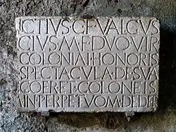 Em retorno ao seu segundo duunvirato, que foi também o duunvirato de seu quinquênio, nos jogos de Apolo [ele apresentou] no Fórum uma procissão, touros, toureiros e seus ajudantes leves, e boxeadores lutando em grupos; no dia seguinte no anfiteatro [ele apresentou] às suas custas trinta pares de atletas e cinco pares de gladiadores, e com seu colega [ele apresentou] trinta e cinco pares de gladiadores e uma caça com touros, toureiros, javalis, ursos e outras variedades de caçadas.