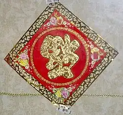 Para as pessoas que falam cantonês, a palavra fook invertida soa como "verter", significando então "verter a sorte"/"desperdiçar sorte", o que simboliza má sorte, por isso a comunidade cantonesa não o pendura de cabeça para baixo. Vermelho é a cor predominante nas celebrações de ano-novo. O vermelho é o símbolo da felicidade ou do prazer, e esta cor simboliza virtude, a verdade e a sinceridade. Nas óperas chinesas, a face de um artista pintada de vermelho pode denotar um personagem sagrado ou leal, ou até mesmo um imperador. Balas, bolos, decorações e muitas outras coisas associadas com o ano-novo e suas cerimônias são coloridos de vermelho. O som da palavra “vermelho” (紅, hóng) é “hong” em Mandarim (Hakka: Fung; língua cantonesa: Hoong) que também significa “próspero”. Portanto, a cor vermelha é e soa como auspiciosa.