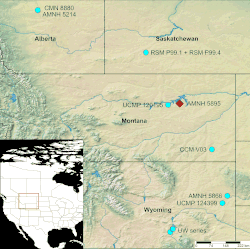 - ↑ Lofgren, D. F. (1997). «Hell Creek Formation». In: Currie, P.J.; Padian, K. The Encyclopedia of Dinosaurs. Cambridge: Academic Press. pp. 302–03. ISBN 978-0-12-226810-6