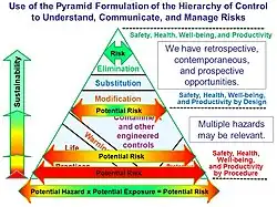 A Figura 2 mostra uma representação alternativa da hierarquia como uma pirâmide de elementos de controle interativo.[13] Os componentes de controle de risco e exposição descritos na formulação da pirâmide da hierarquia de controle são: