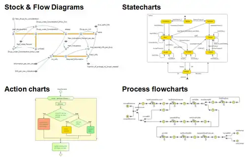- Gráficos de ação (Action charts) são usados para definir algoritmos. Eles podem ser utilizados nos modelos de eventos discretos, por exemplo, para o roteamento de chamadas, ou em modelagem baseada em agentes, por exemplo, para a lógica de decisão do agente.