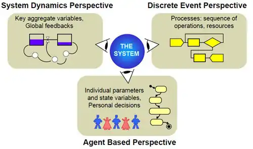 Dinâmica de sistemas é utilizada para o entendimento do comportamento de sistemas complexos, é obviamente usado no nível de abstração mais elevado. Modelagem por eventos discretos é usada em baixa em baixa e médio nível de abstração. Quanto à modelagem baseada em de agentes, esta tecnologia é usada em todos os níveis de abstração. Um agente pode ser modelado como objetos de diversas naturezas e escalas. Os agentes de nível “baixo” podem ser, por exemplo, pedestres, carros ou robôs; no nível médio - os clientes e ao nível mais alto - as empresas concorrentes.