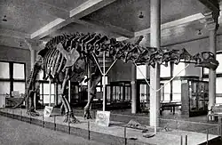 Montagem de Apatosaurus (FMNH P25112) no Museu Field de História Natural na década de 1950, com seu crânio original reconstruído de forma imprecisa