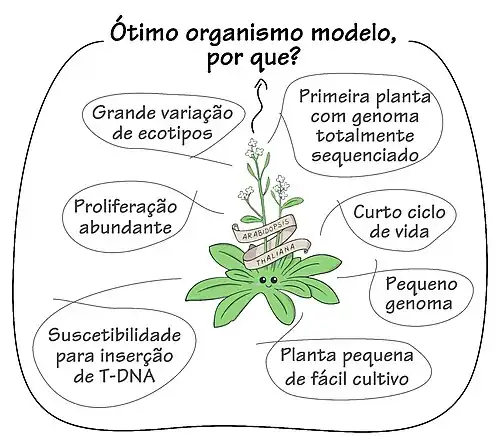 Suas características como o curto tempo de geração, um tamanho pequeno e a alta produção prolífica de sementes por autopolinização, foram os aspectos preliminares que fizeram com os pesquisadores a adotassem como o principal organismo modelo para a biologia vegetal. Além disso, o papel crescente da genética na integração de disciplinas (Pruitt et al., 2003) somado às importantes ferramentas da biologia molecular disponíveis, levaram os cientistas biólogos ao consenso da necessidade de concentrar os estudos num único organismo - a fim de alcançar análises mais profundas - o que fortaleceu o avanço das pesquisas sobre a A. thaliana. Neste tópico, discorreremos sobre a história dos estudos dessa planta, enfatizando os aspectos mais importantes que permitiram a produção de conhecimento científico em múltiplas áreas da biologia, sobretudo na genética.