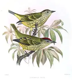 Oxyruncus cristatus frater, ilustração de Smit, em Exotic ornithology: containing figures and descriptions of new or rare species of American birds, 1869.