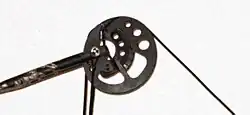 - O sistema de polias normalmente irá incluir alguns blocos cobertos de borracha que funcionam como um fixador. O arqueiro puxa até um determinado ponto e então ele "fixa" nesse ponto, que pode ser ajustado de acordo com a extensão natural da força do arqueiro. Isso ajuda o arqueiro a conseguir um "ponto de âncora" e uma consistente quantidade de força concedida à flecha em todos os disparos, aumentando ainda mais a precisão.